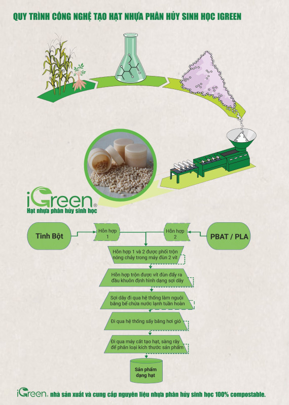Quy trình tạo ra sản phẩm sinh học phân hủy sử dụng nguyên liệu hoàn toàn được làm từ nguyên liệu thực vật tái tạo hàng năm. Sản phẩm IGREEN phân hủy sinh học hoàn toàn thành CO2, nước và mùn hữu cơ trong vòng 180 ngày do tác động của vi sinh vật trong môi trường ủ phân phù hợp.