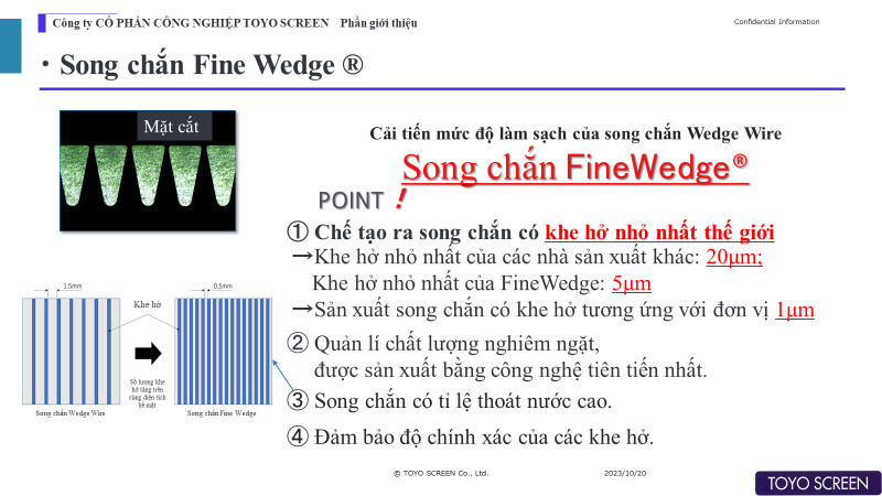 - Điểm mạnh song chắn Toyo Screen: Song chắn của các nhà sản xuất khác có khe hở nhỏ nhất là 20μm, bề rộng của dây nêm to và tỉ lệ thoát nước thấp cho nên không thể thu hồi được cặn mịn.